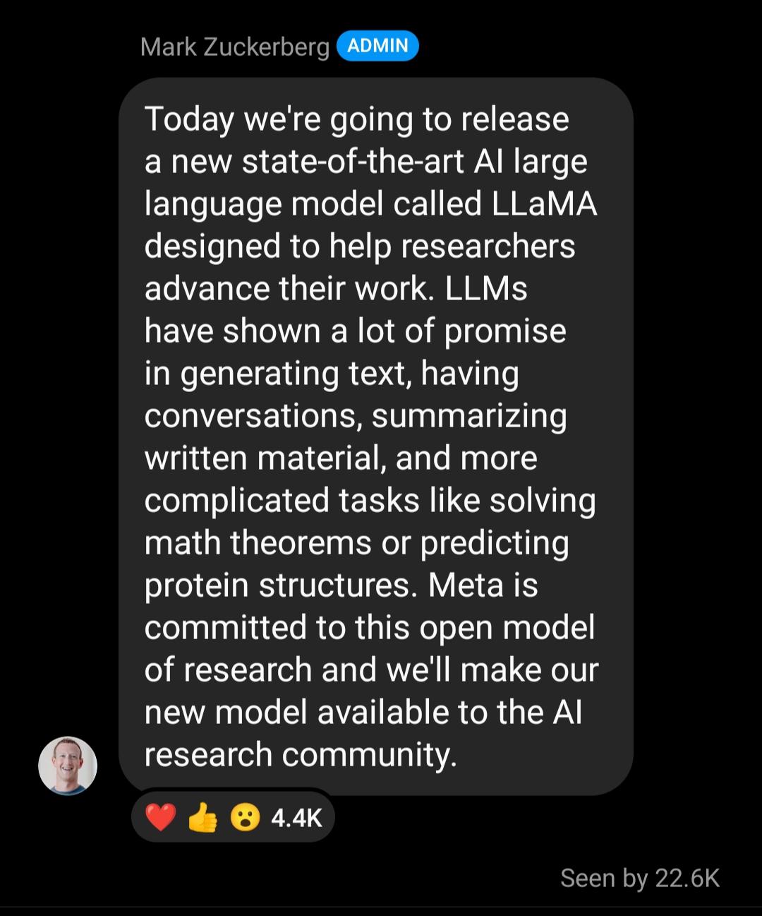 "Today we're publicly releasing LLAMA, a state-of-the-art foundational LLM, as part of our ongoing commitment to open science, transparency and democratized access to new research.