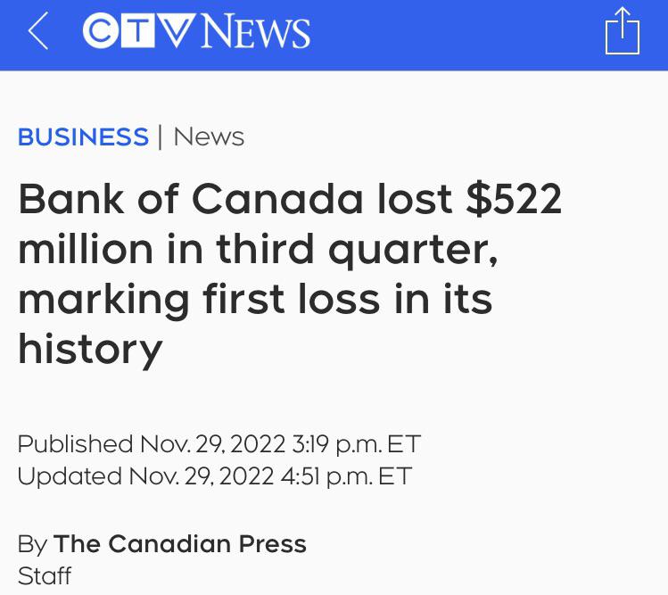 Bank of Canada lost $522 million in third quarter, marking first loss in its history ctvnews.ca Submitted by Prometheus_3_6_9 t3_z8dabp on November 30, 2022 at 1:43 AM in news 55 comments 411