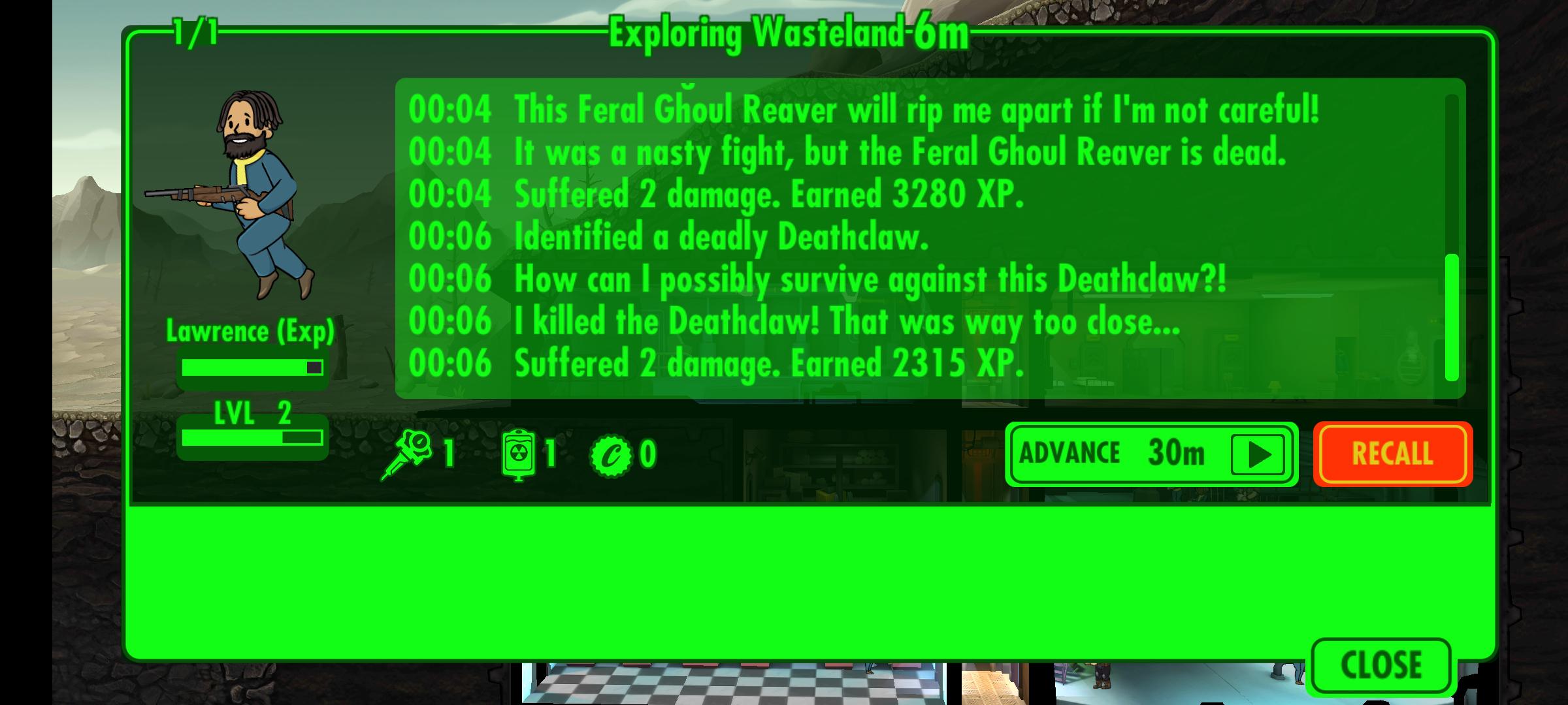 [Fallout Shelter] Started a new game, and sent this fresh dweller out to the wastes, and in the span of 12 minutes killed a deathclaw, an enclave deathclaw, and 2 centaurs. No special stats, no nothing. Submitted by StoneWolf356 t3_yrpq1f on November 10, 2022 at 7:45 PM in gaming No comments 0