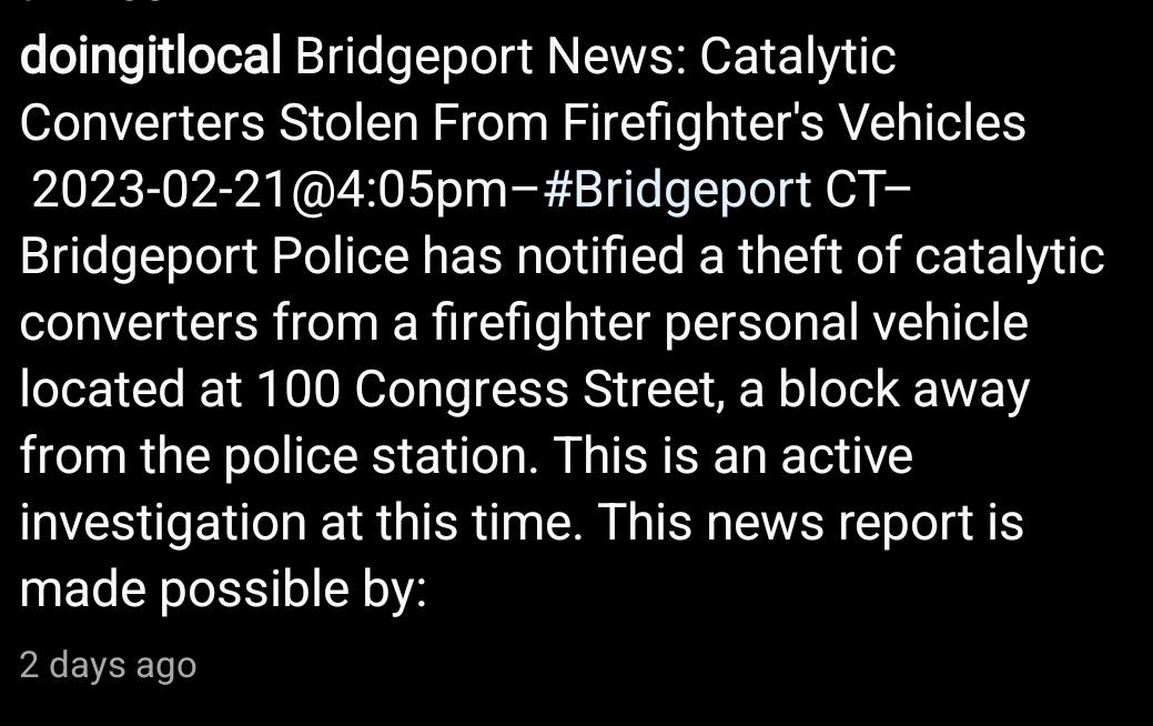 bridgeport firefighters catalyst converter stolen at fire dept Submitted by Technical_Success987 t3_11af5qz on February 24, 2023 at 1:43 AM in Connecticut 81 comments 115