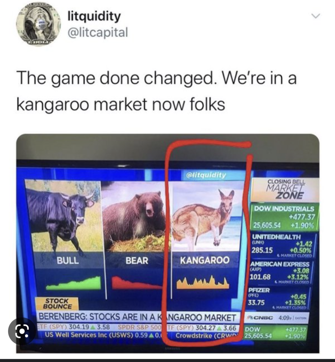 Enough of the bears enough of the bulls I'm ready for the kangaroos! Submitted by Unknownirish t3_10ubgvd on February 5, 2023 at 12:36 PM in wallstreetbets No comments 2