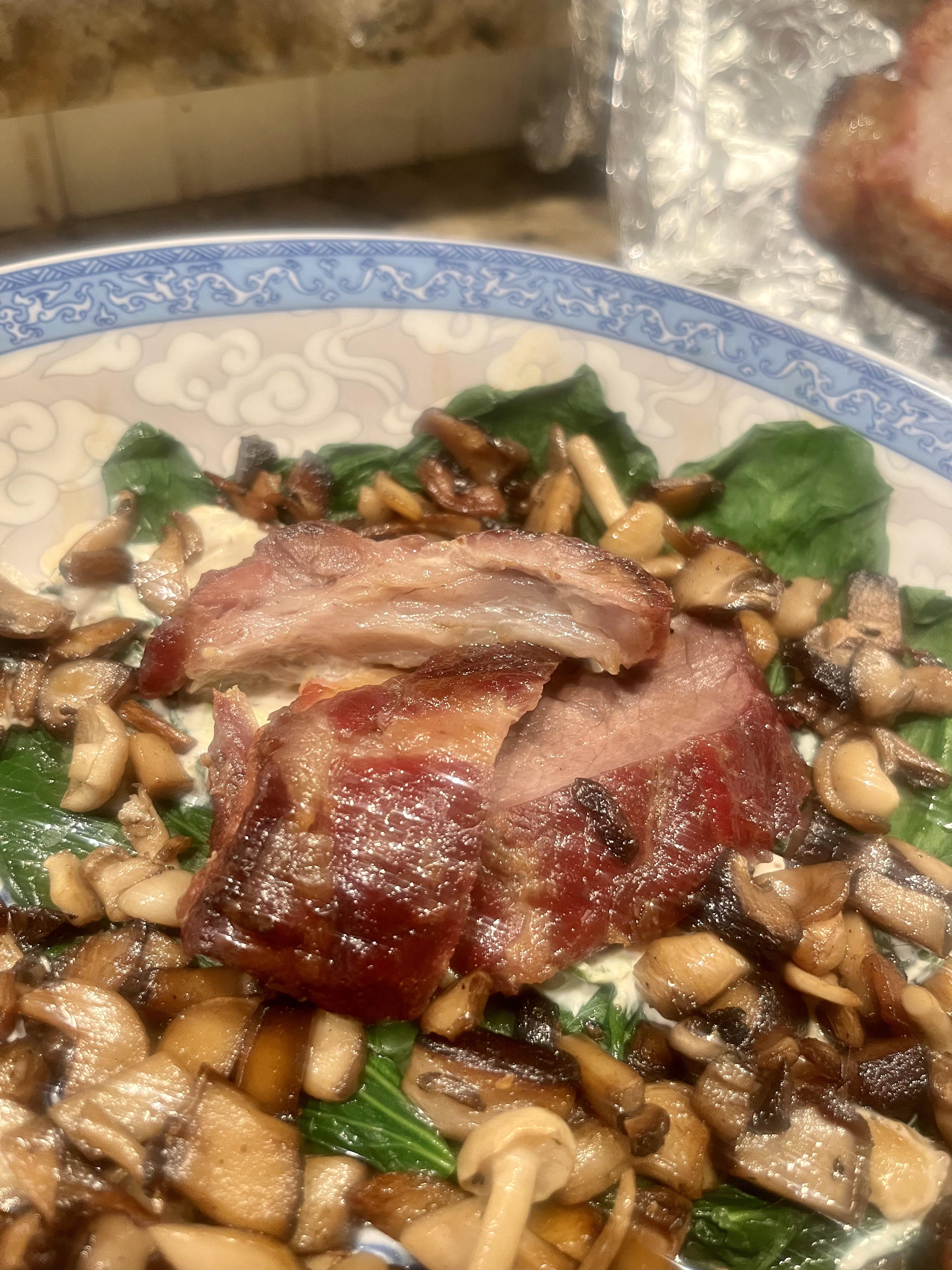 Not marinated, tho I bet it could be so long as it was dried off before cooking. It’s a pork belly rubbed in some salt and then put in an oven until ready. I was hoping to use the pork belly skin to make cracklings to mix into the mushrooms but the skin didn’t survive the roasting and had to be discarded (was able to cook the mushrooms in some of the oil the pork belly exuded tho!)