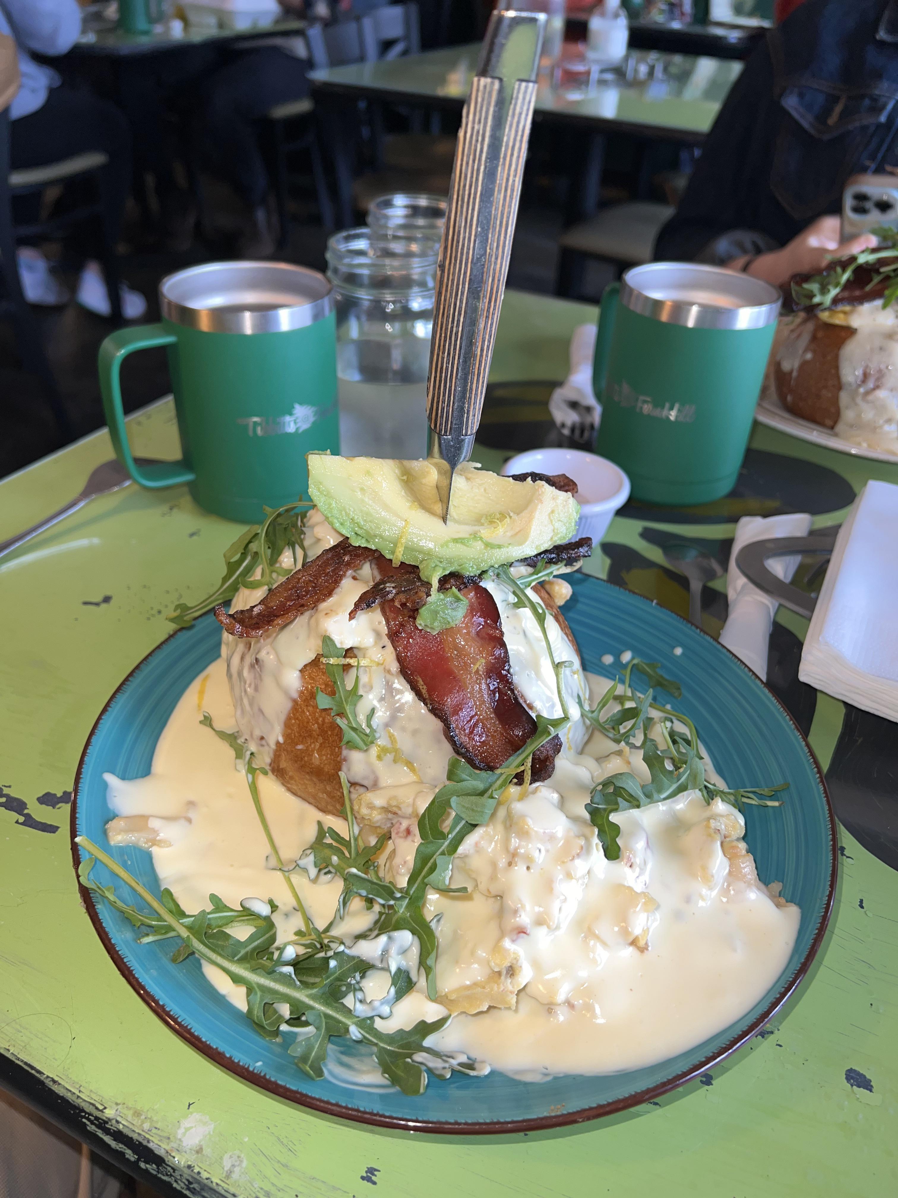 Love the comments that can’t comprehend it even though sausage, eggs, and biscuits w white gravy can be found at just about any diner. This is just a seafood version essentially. Instead of biscuits it’s sour dough. Instead of sausage it’s lobster. Instead of white gravy it’s a lobster bisque like sauce. Not that crazy. But super tasty and filling.
