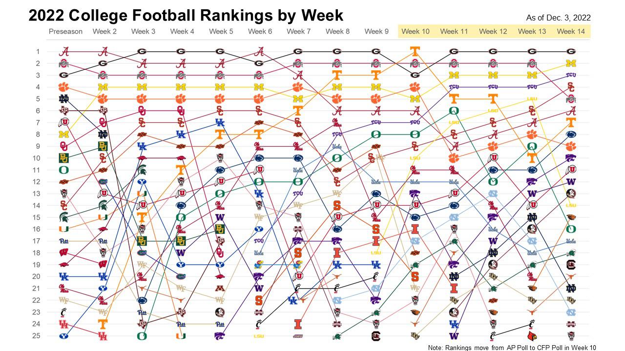 This was made using PowerPoint. I utilized the AP Poll rankings for Preseason through Week 9 and the College Football Playoff rankings for Weeks 10-14. I don’t like changing sources midway through the year, but there’s no CFP ranking before week 10 and it’s the only one that “matters” starting that week. I’ve personally found the AP Poll to be more authoritative than the Coaches Poll, which is why I chose to use that for the first 10 weeks.