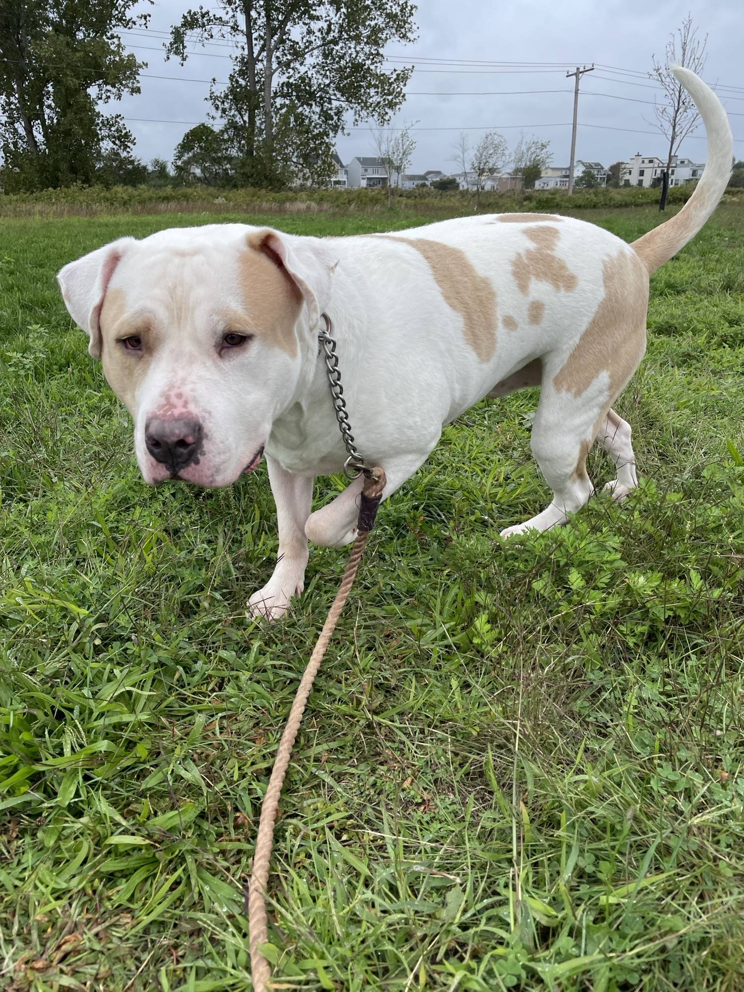 Impound #2 "Dave" large (just over 100lbs) Pitbull Mix, male neutered, white with liver spots. We estimate his age at about 4 or 5 years old.