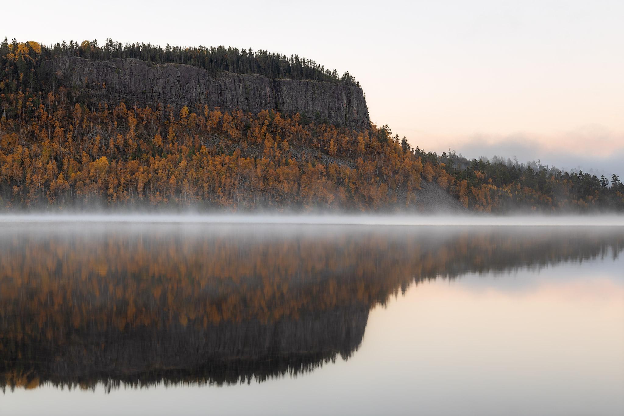 Hello everyone. This image was taken during a recent 5 day Thru-Hike of the 65 mile Border Route Trail hugging the Minnesota & Canadian border in the BWCAW. On day 2 we camped here at Clearwater Lake opposite these Palisades that were covered in gorgeous golden autumn leaves. The subtle light from the sunrise off to the left of the frame was just enough to illuminate the trees and the fog drifting over the lake.